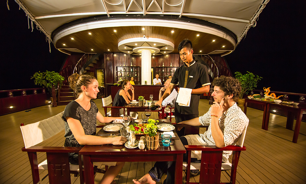 20:30: Have dinner and free time for communicating with staffs, evening activities (squid fishing, beauty spa…) and service on board. Overnight on board..