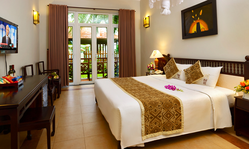 4km from the ancient town and next to the De Vong River and Cua Dai Beach. The hotel consists of 121 luxurious deluxe and villa rooms, all of which evoke a traditional Vietnamese village style with views across manicured gardens, beach, river and lush paddy fields. Source: the hotel