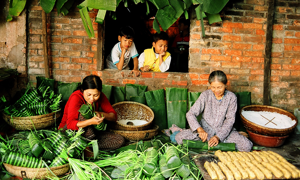 An alternative, for the afternoon tour, is to visit the house where the traditional rice cakes are made. You can see the way in which the banana leaf is shaped to create a box or wrapper to contain a specific type of cake which is then steamed in large vats. The cakes are also part of the Tet celebrations but also eaten throughout the year.