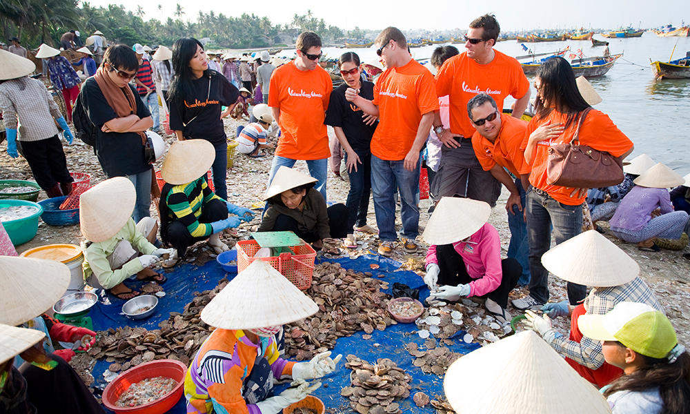 Day 2 (BF/L): Visit the vibrant Can giuoc market then heading toward Go Cong amongst the rice fields via Kenh Nuoc Man island and visit a traditional rice wine production household, an ancient house with 130 pillars dating back to the 18 century. On the road, guest will visit a traditional mother of pearl inlay village and many agricultural production unit along the road. The tour will continue toward the river’s mouth of the Mekong and visiting clam farming area of Tan Thanh. Lunch will be at a stilted restaurant over the sea.